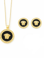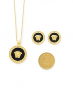 • Detalii: Pandantiv si cercei rotunzi cu medalion Medusa în relief 3D, finisaj oglindă; lanț tip curb (double curb) cu aspect solid.