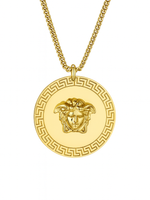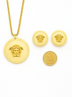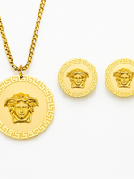 Detalii: Pandantiv si cercei rotunzi cu medalion Medusa în relief 3D, finisaj oglindă; lanț tip curb (double curb) cu aspect solid.