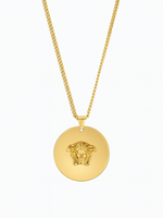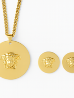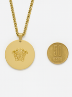 • Detalii: Pandantiv si cercei rotunzi cu medalion Medusa în relief 3D, finisaj oglindă; lanț tip curb (double curb) cu aspect solid.